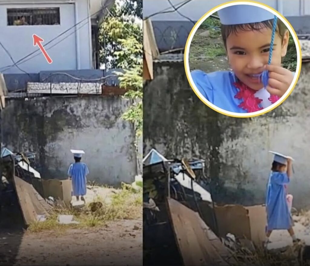 While most five-year-olds celebrated with hugs and photos, this little girl stood outside a concrete barrier in her cap and gown, determined to make sure her mother didn’t miss the moment. From a barred second-floor window, her mom reached out as far as she could. No embrace. No ceremony. Just love stretching across distance, iron, and circumstance.