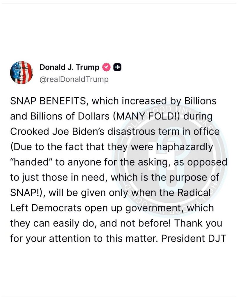 Donald Trump announced earlier today that he will not be releasing SNAP payments until the government is reopened. However, the White House press secretary later stated that the administration will proceed with issuing the benefits.