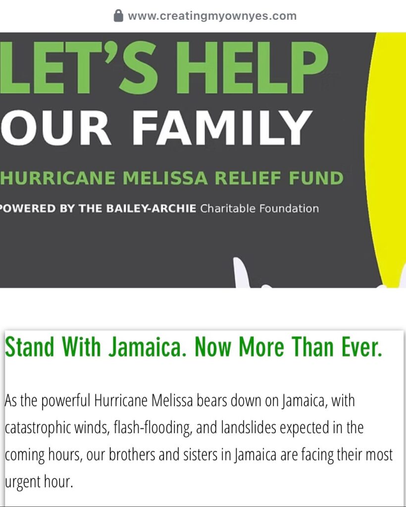 “My heart is heavy as our beloved island of Jamaica faces the devastating impact of Hurricane Melissa. Many families are bracing for loss — homes destroyed, children without basic necessities, elders and persons with disabilities struggling to find safety and support. They need us now more than ever.” 💛💚🖤