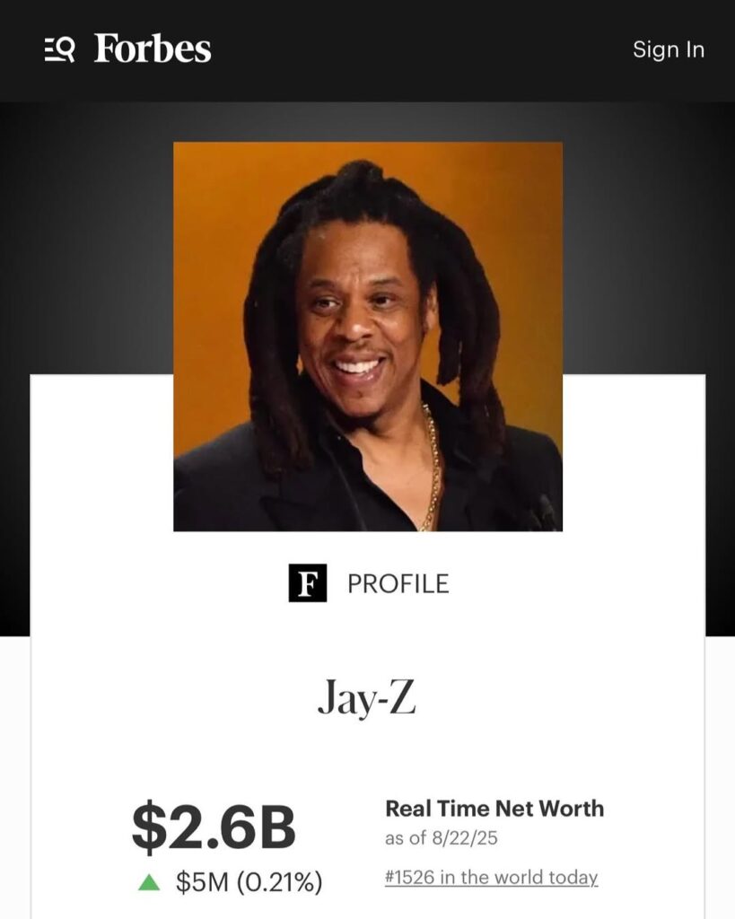Forbes credits his fortune to a powerhouse mix of ventures: Roc Nation, Armand de Brignac (Ace of Spades) champagne, D’Ussé cognac, Tidal streaming service, Rocawear fashion, plus major plays in real estate, tech, and startups.