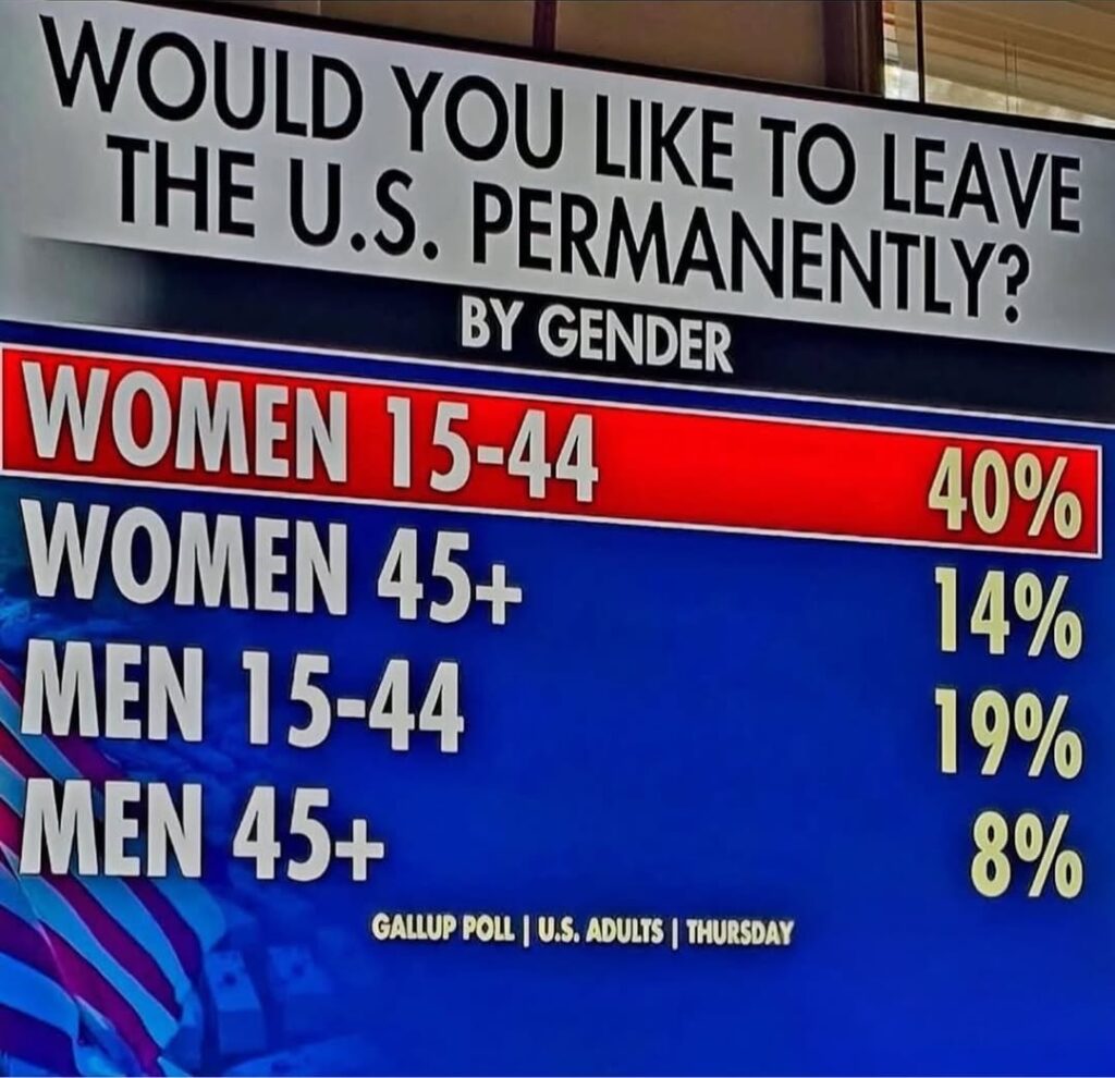 New Gallup data highlights a striking divide in how different groups of Americans feel about life in the U.S. According to the survey, 40% of women ages 15–44 say they would like to leave the U.S. permanently — the highest percentage of any demographic measured.