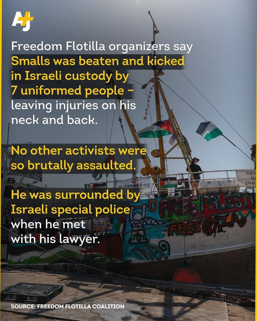 The Freedom Flotilla Coalition says that Smalls was the only activist treated this severely by Israeli forces.
