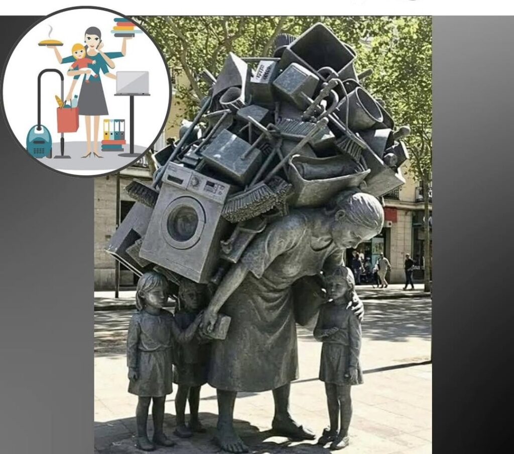 The artwork challenges the persistent myth that women who stay home “do nothing,” highlighting the critical, unpaid labor that keeps families and societies functioning, yet remains undervalued worldwide.