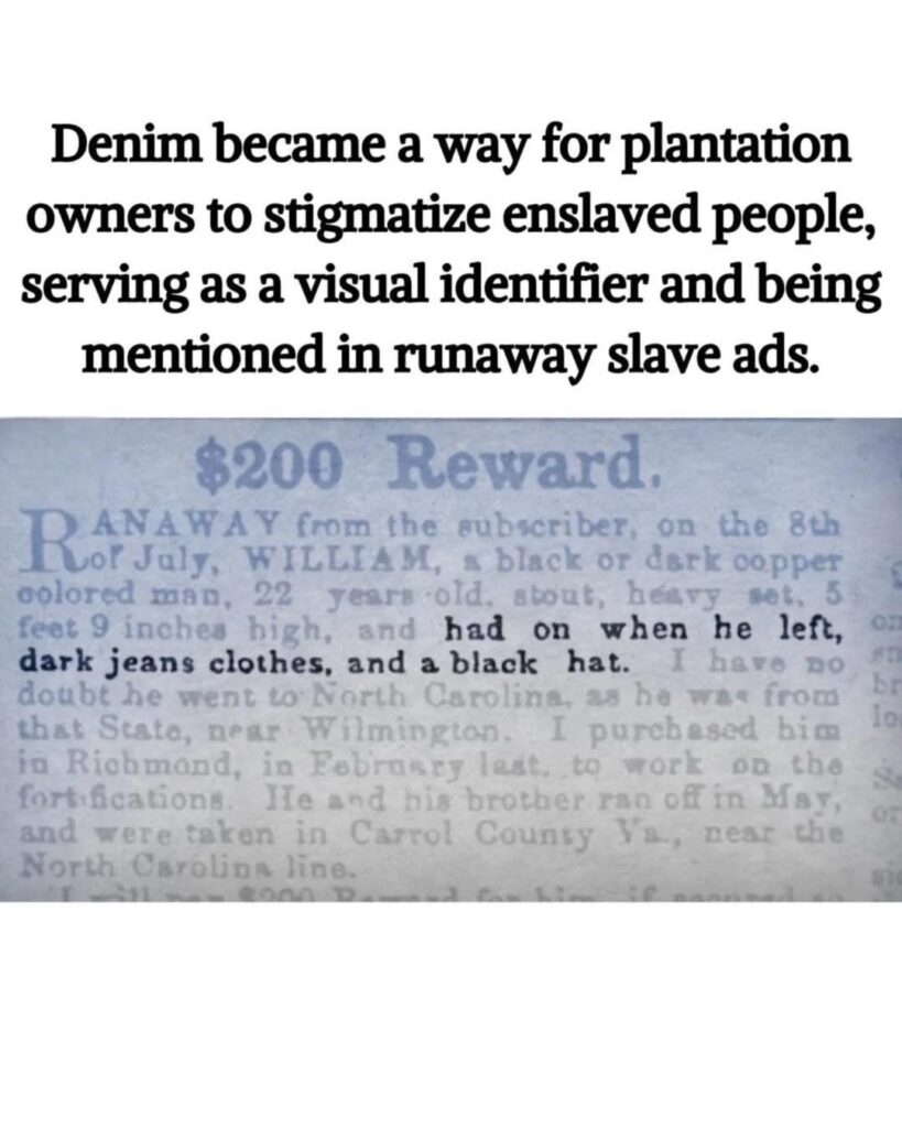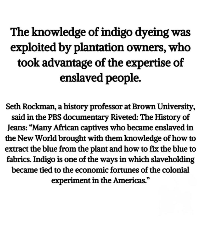 The deep blue color that defines denim came from indigo dye, a process perfected by enslaved people who brought their expertise from West Africa to the Americas. They knew how to extract and fix the dye — knowledge that plantation owners later exploited for profit.