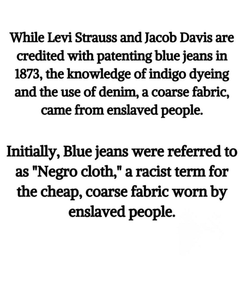 While Levi Strauss and Jacob Davis are credited with patenting blue jeans in 1873, the real roots of denim trace back to the skills and knowledge of enslaved Africans. The deep blue color that defines denim came from indigo dye, a process perfected by enslaved people who brought their expertise from West Africa to the Americas. They knew how to extract and fix the dye — knowledge that plantation owners later exploited for profit.