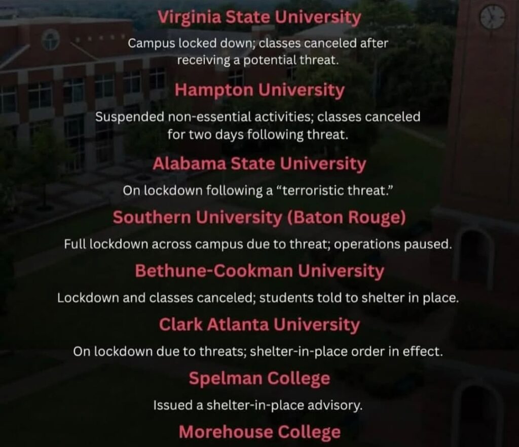 HBCUs Targeted by Threats, Campuses Shut Down Nationwide. Several Historically Black Colleges & Universities — including Clark Atlanta, Spelman, Morehouse, Hampton, Virginia State, Southern, Bethune-Cookman, and more — were forced to issue lockdowns, shelter-in-place orders, and class cancellations today after receiving threats.