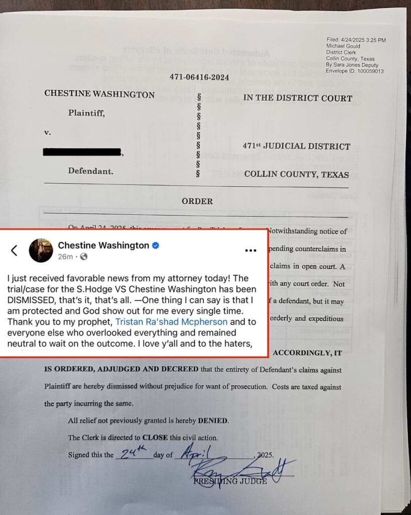 “Just received favorable news from my attorney today! The trial/case for the **** vs Chestine Washington has been DISMISSED, that’s it, that’s all.